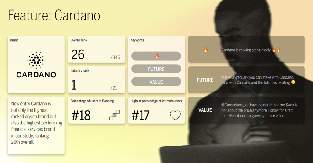 Napříč 19 analyzovanými odvětvími se mezi 10 nejlépe hodnocenými objevilo kryptografické zboží. Přičemž na prvním místě se umístilo Cardano, následované Bitcoinem jako značkou na 30. místě. Zatímco kryptoznačky jako Uniswap a Solana se umístily na 261., respektive 265. místě. V porovnání s loňským rokem je podle průzkumníků Cardano nejen novinkou, ale také nejvýše umístěnou značkou v oblasti krypto a nejvýkonnější značkou finančních služeb ve studii.