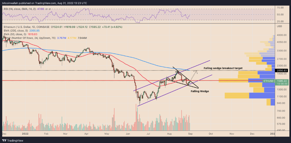 Cena ETH od poloviny srpna klesá ve tvaru klesajícího klínu. Nedávno se po otestování spodní trendové čáry struktury odrazila k horní trendové čáře a nyní vyhlíží proražení směrem ke 2 000 USD (49 000 CZK) nebo nad ni, jak můžete vidět níže.