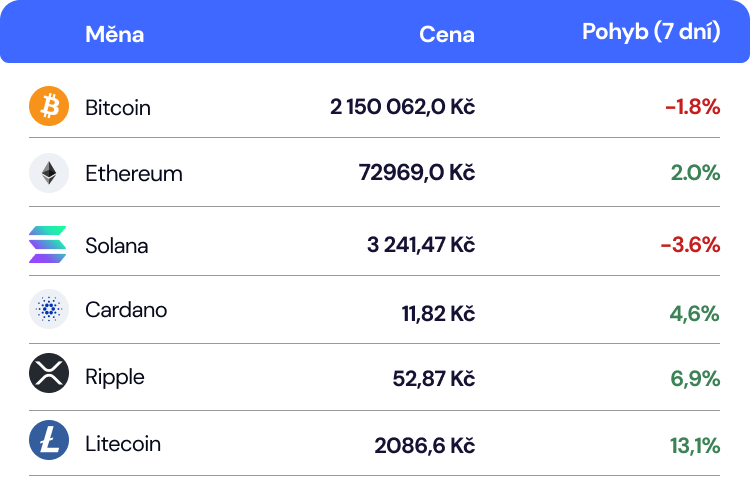 Pohyb vybraných kryptoměn na burze Coinmate v období od 6.11. do 13.11.2025