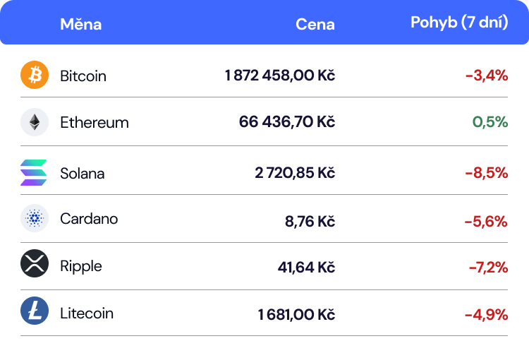 Pohyb vybraných kryptoměn na burze Coinmate v období od 4.12. do 11.12.2025